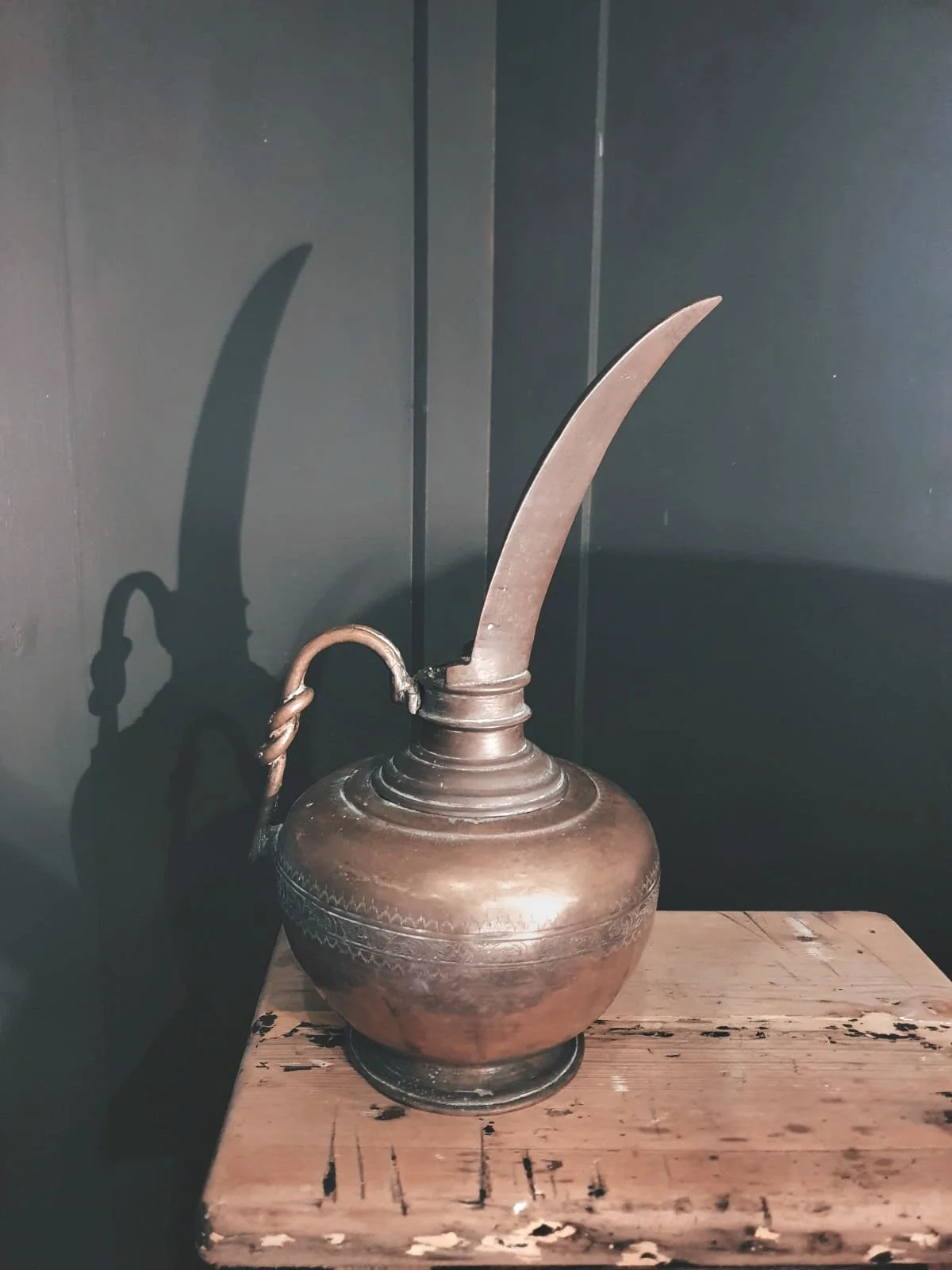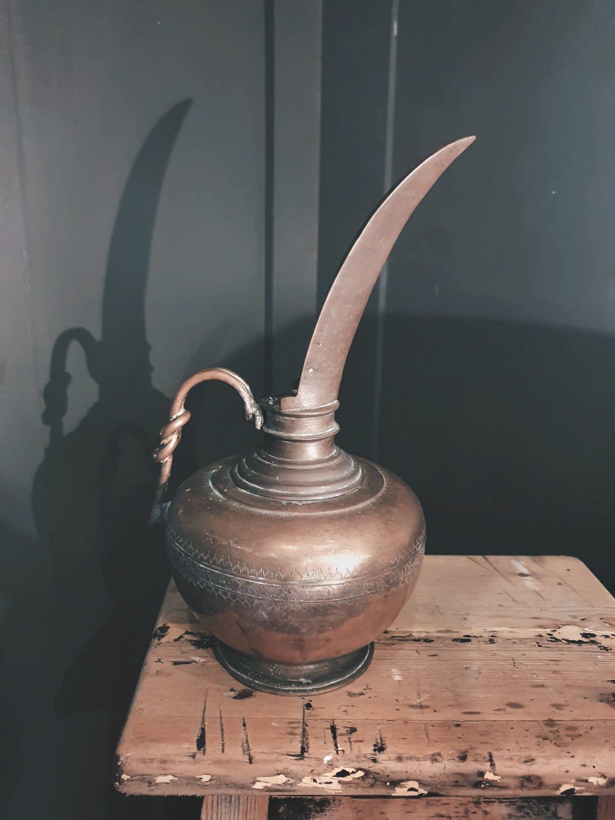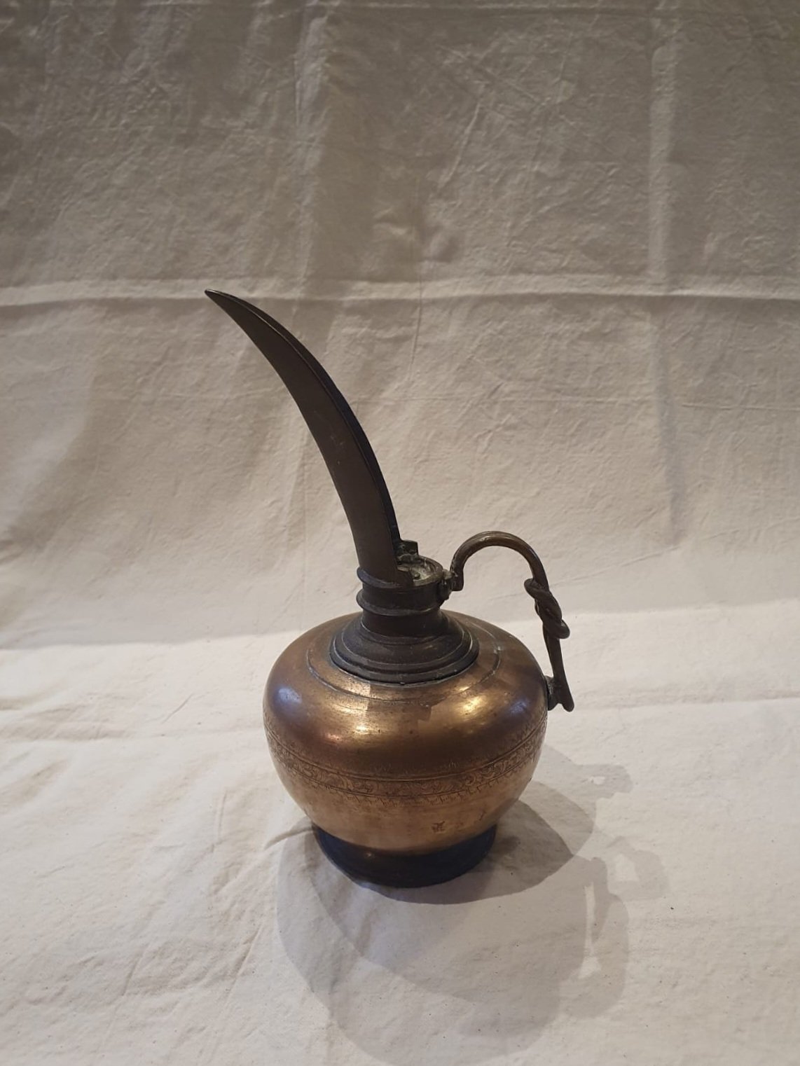 This beautiful antique brass pourer is just what you would see in the story of Aladdin. With it's heavy, solid brass and the delicate etchings, it has probably travelled miles along the corridors in the Palaces of Persia, carrying oil to light the lamps. It has a strikingly long spout, giving it a glamorous and elegant appearance. It will make a stunning ornament as it catches and reflects the light.