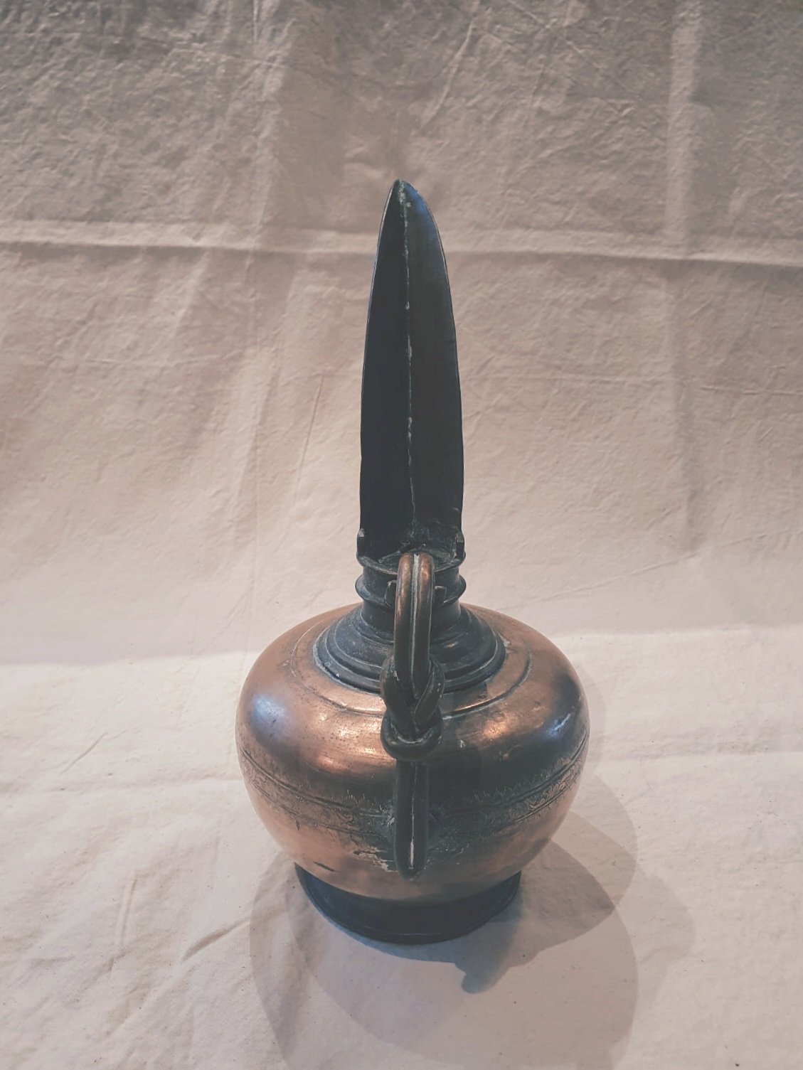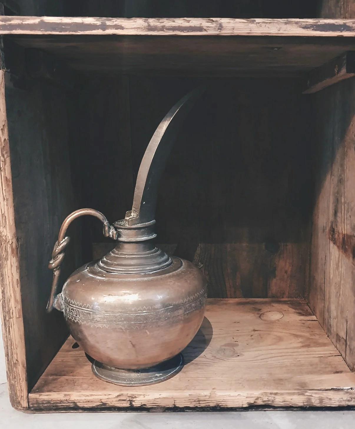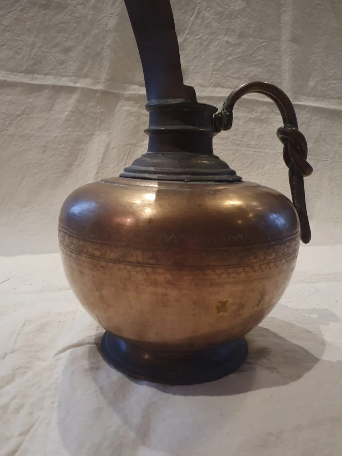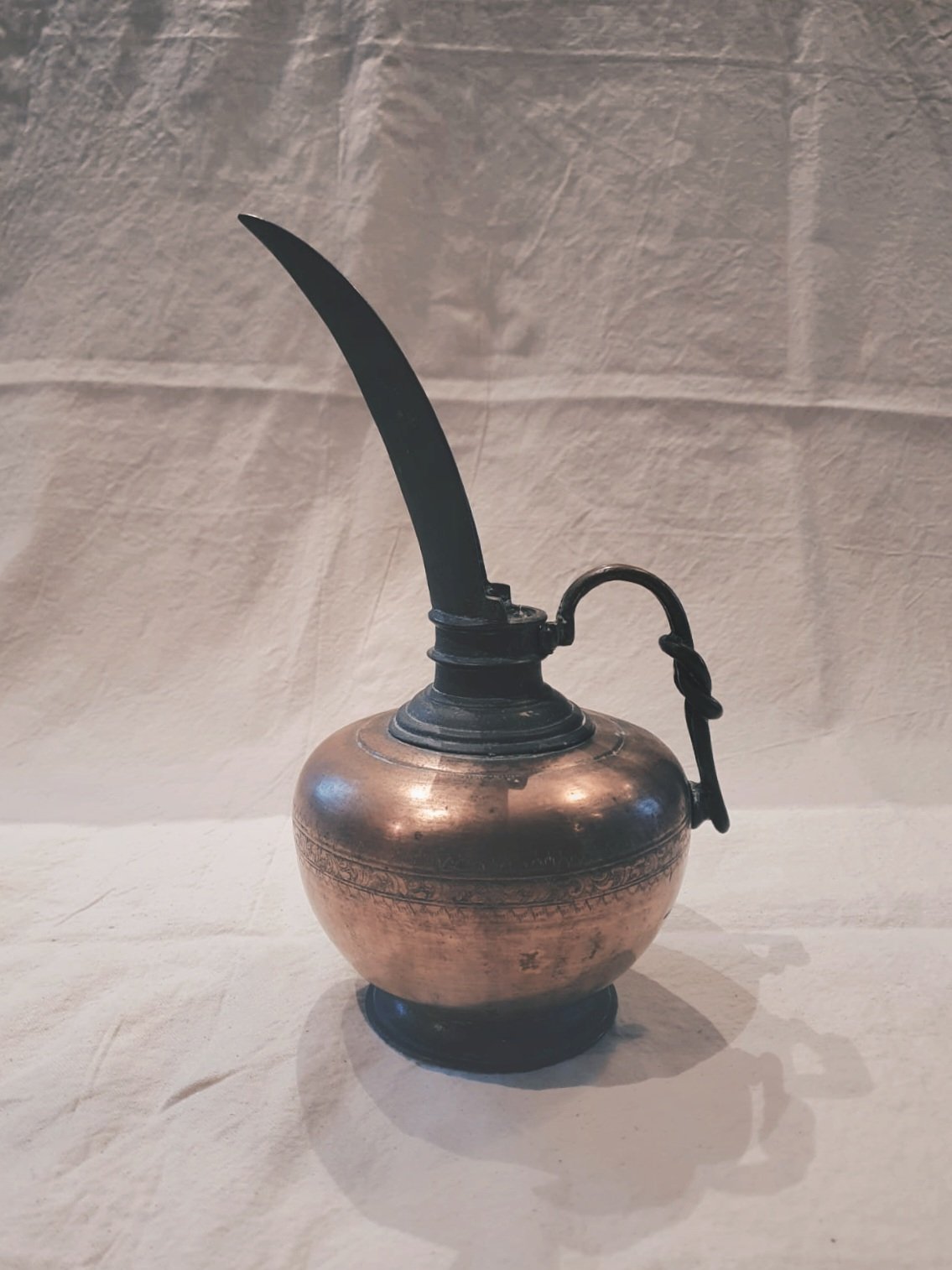 This beautiful antique brass pourer is just what you would see in the story of Aladdin. With it's heavy, solid brass and the delicate etchings, it has probably travelled miles along the corridors in the Palaces of Persia, carrying oil to light the lamps. It has a strikingly long spout, giving it a glamorous and elegant appearance. It will make a stunning ornament as it catches and reflects the light.