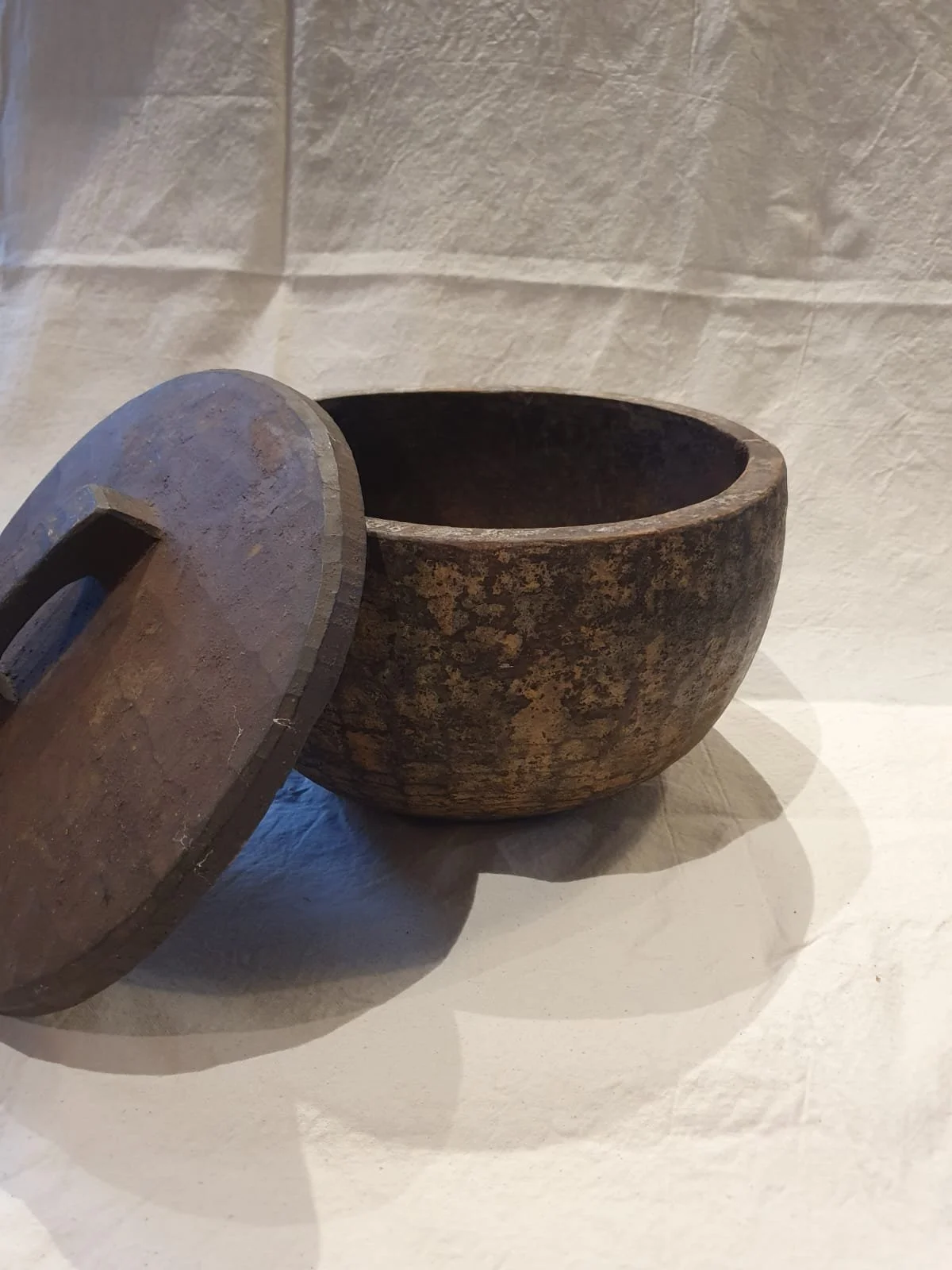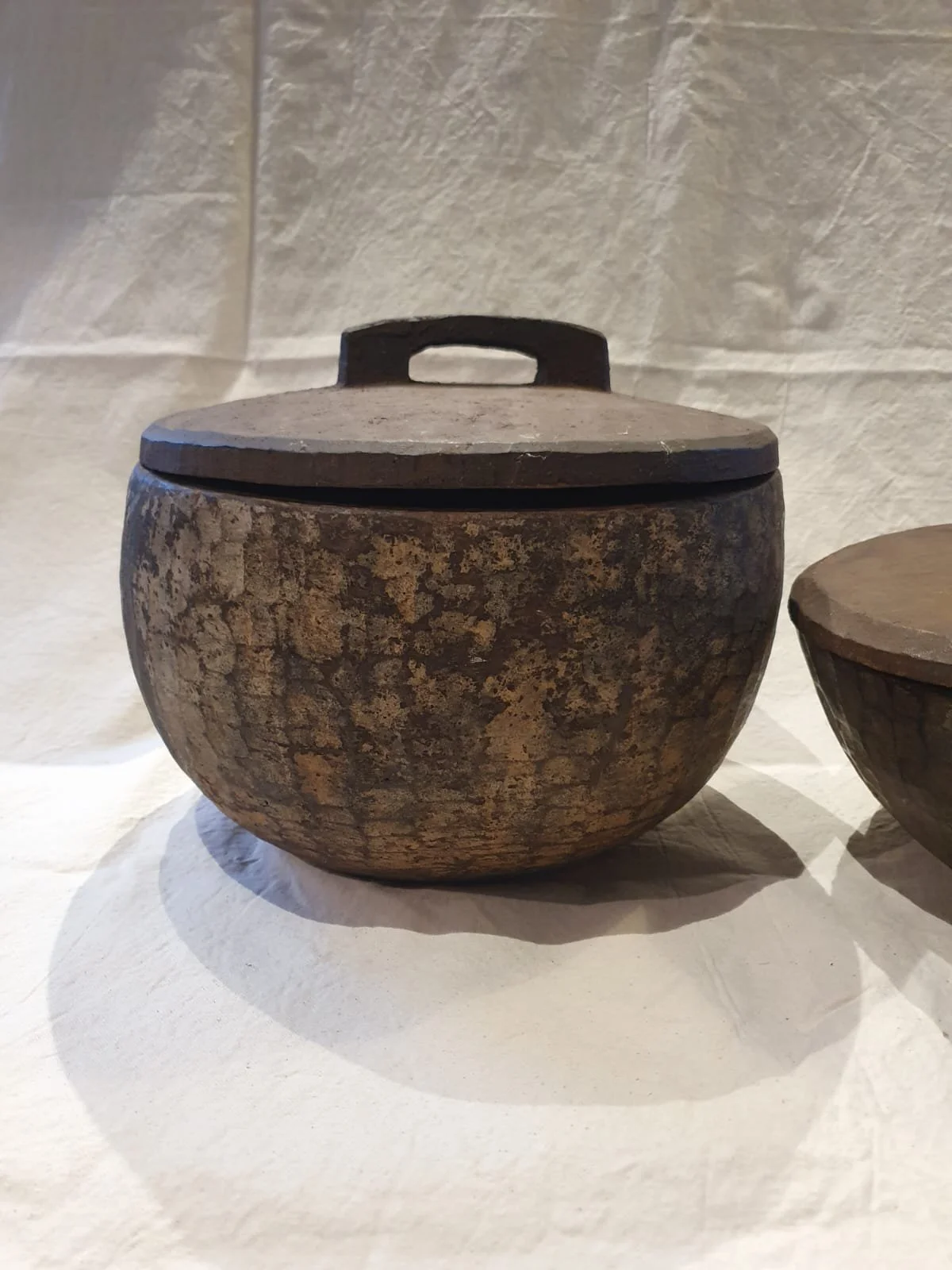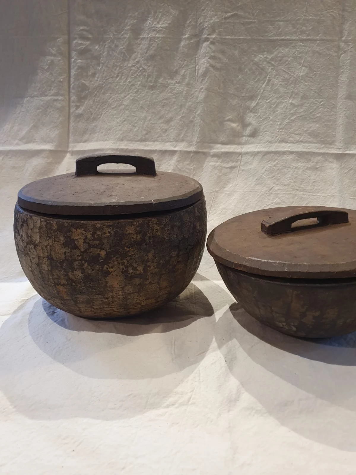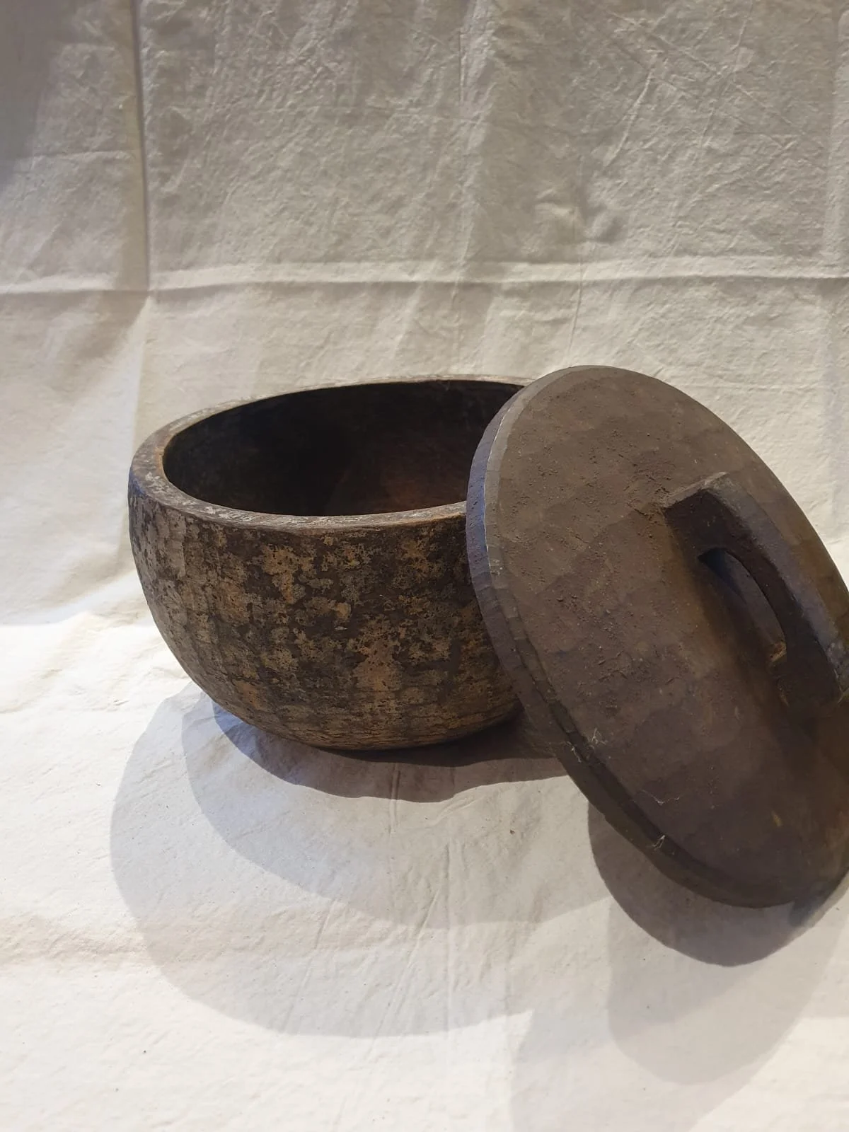 These large wooden bowls are rustically carved and come from the Nagaland area. Very lightweight, they were coated in a mud type mixture to preserve them and keep their contents cool. They were used to carry wares from village to village as they looked to trade and earn their living. They are now just incredible relics and could be used to store kindling or any other dry goods you think of, but mainly they will just give your decor an incredible WOW factor.